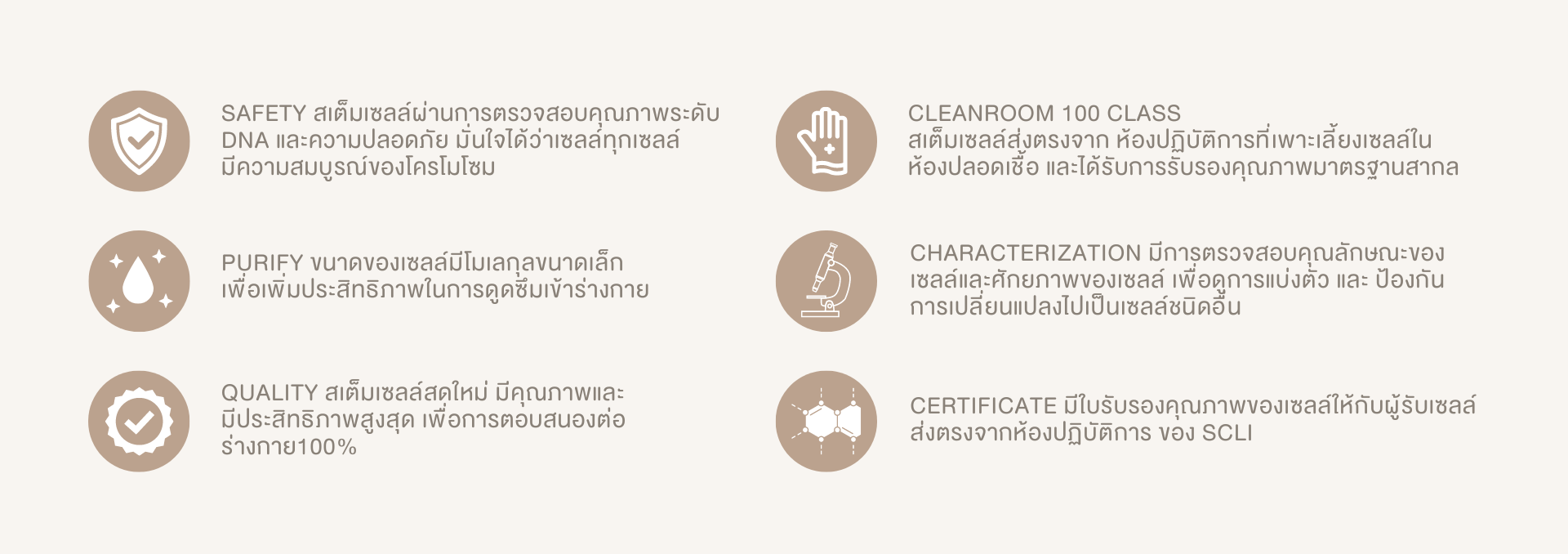 ไม่ใช่ Stem Cell จะมีคุณภาพเท่าเทียมกันทั้งหมด การได้รับ Stem Cell ที่ไม่มีประสิทธิภาพ จะไม่เกิดประโยชน์ในการรักษาและอาจทำให้เกิดผลเสียต่อร่างกายได้ การรับเซลล์บำบัดทุกรายการที่ KARNESH WELLNESS เป็นเซลล์สดใหม่ ที่ทางห้องปฏิบัติการได้การเพาะเลี้ยงตามออเดอร์ของลูกค้าเท่านั้น โดยเซลล์ถูกส่งตรงจากห้องปฏิบัติการที่ได้รับมาตรฐาน และเน้นคุณภาพของเซลล์ โดยเซลล์จะต้องมีขนาดโมเลกุลที่เล็กเพื่อประสิทธิภาพการดูดซึมเข้าร่างกาย เพื่อประสิทธิภาพสูงสุดในการตอบสนองต่อร่างกาย มาพร้อมกับใบรับรองคุณภาพของเซลล์ เพื่ออธิบายรายละเอียดและรับรองคุณภาพเซลล์ จึงรับประกันได้ว่าคุณจะได้รับการรักษาที่ดีที่สุด